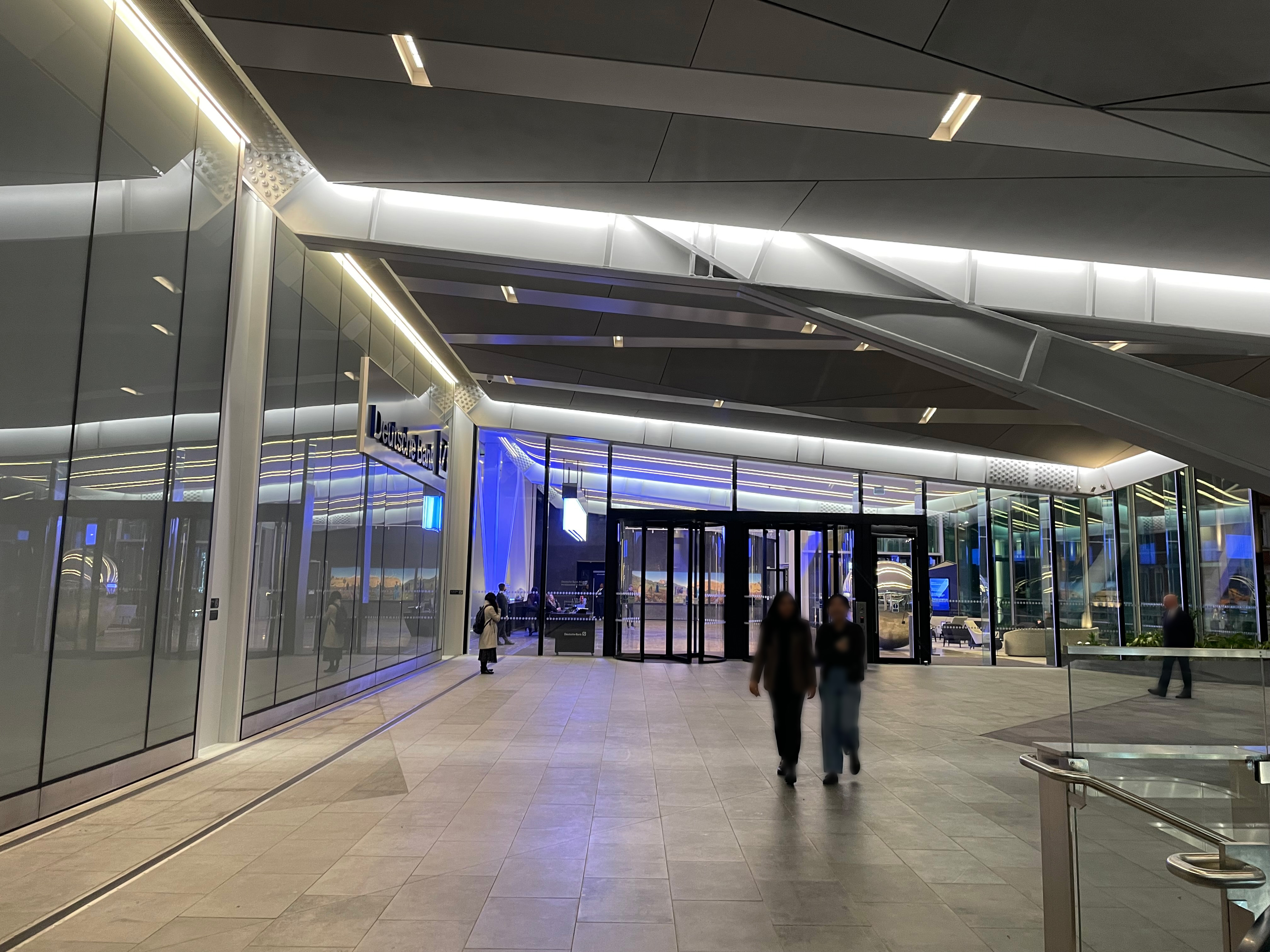 Suspended above a complex train interchange using a unique steel bridging structure, in a single column-free span without disrupting daily railway operations.